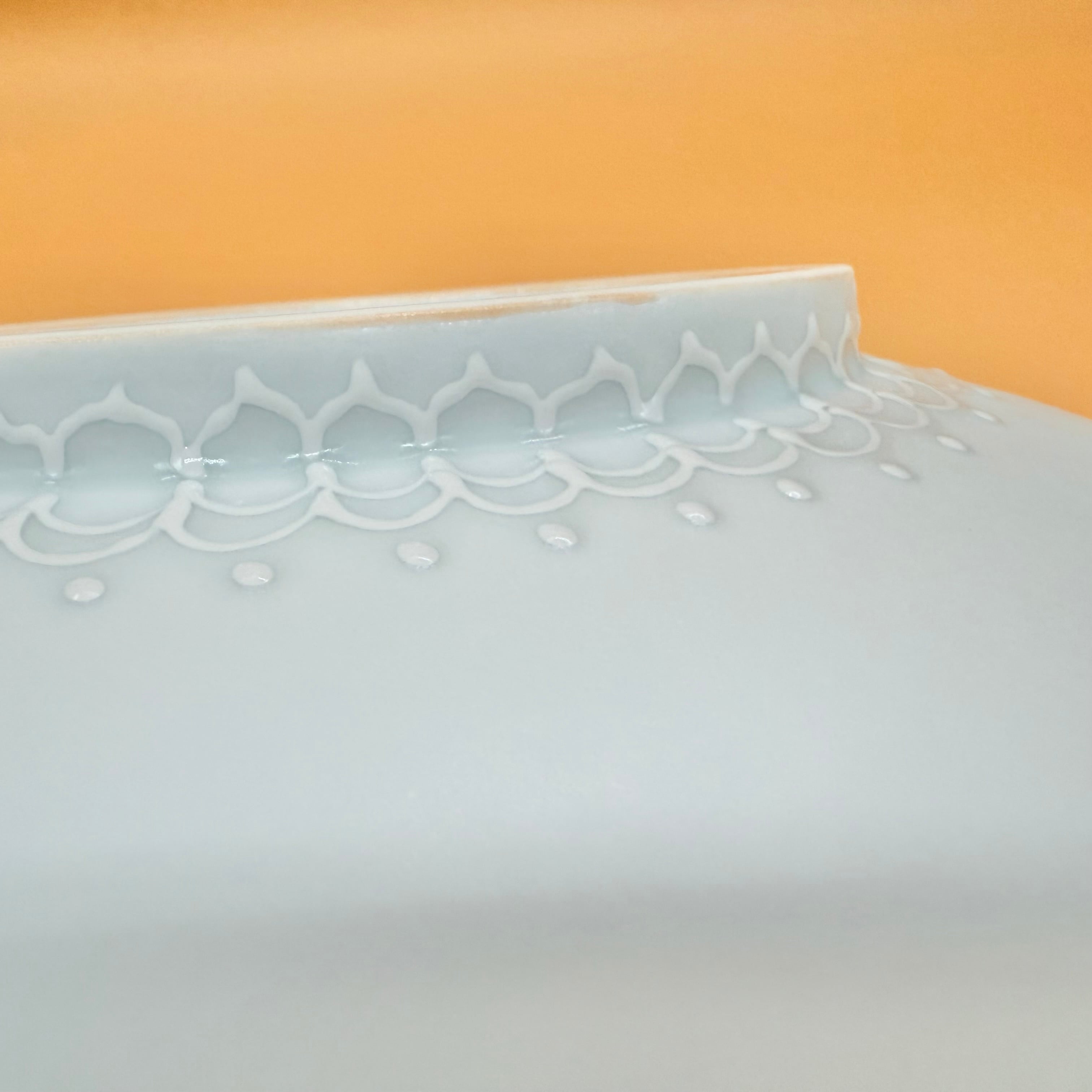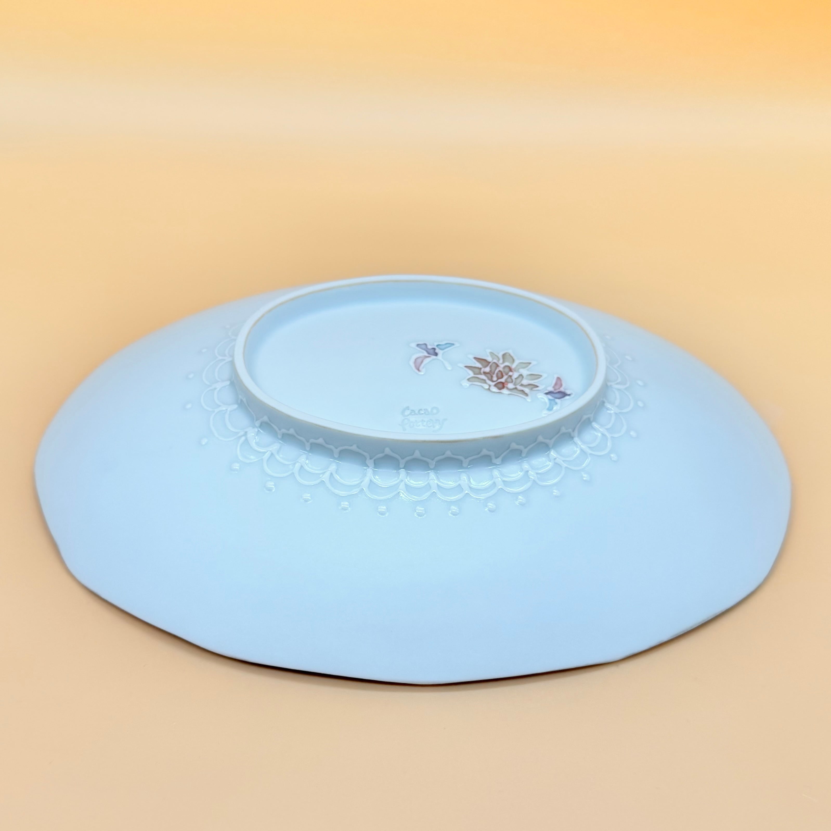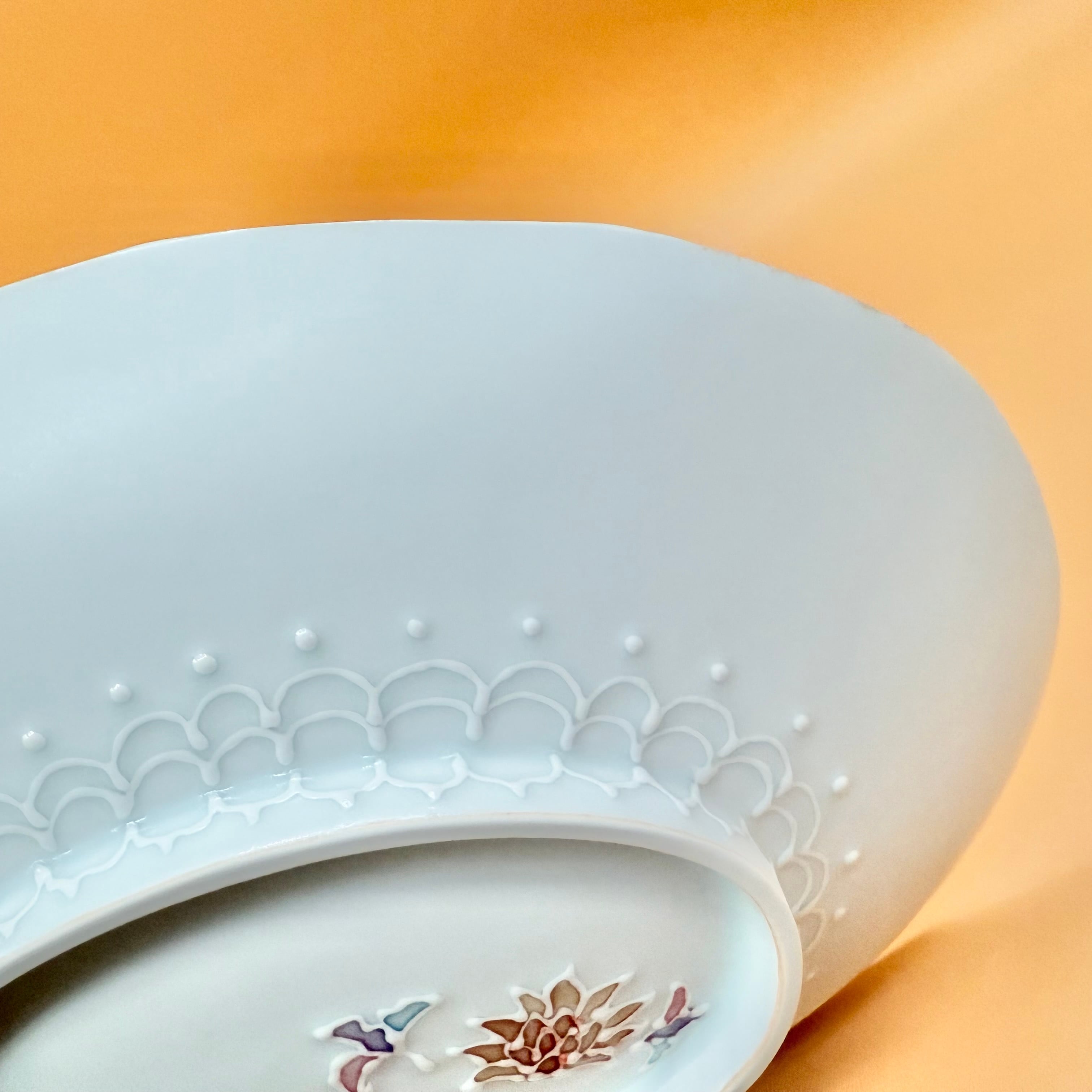 伝統紋様【牡丹唐草】と伝統技法【イッチン】の組み合わせですが水彩画のような淡い色彩をのせることで和にも洋にも感じるモダンな雰囲気に仕上がりました。